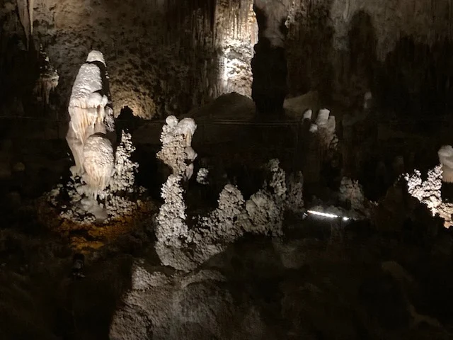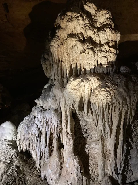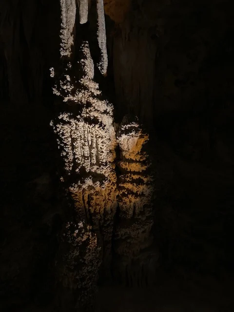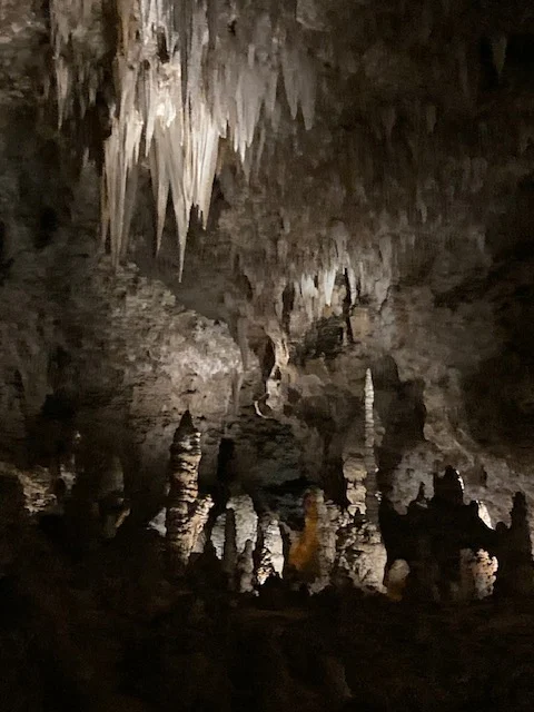 Descending into the darkness was both eerie and magnificent. Realizing the smallness of my stature and its insignificance in the scope and size of the caves is awe inspiring. I’m grateful for the paths created giving a stability to explore without destroying anything in the environment. One interesting thing I didn’t think about is no matter how careful we are, we always leave something behind – the lint that falls when clothes rub against itself as we walk, the piece of hair that falls to the ground, the moisture of our breath as it sinks to the floor. I thought it was interesting how some of those things, like the lint, actually become food for the spiders who live in the caves.