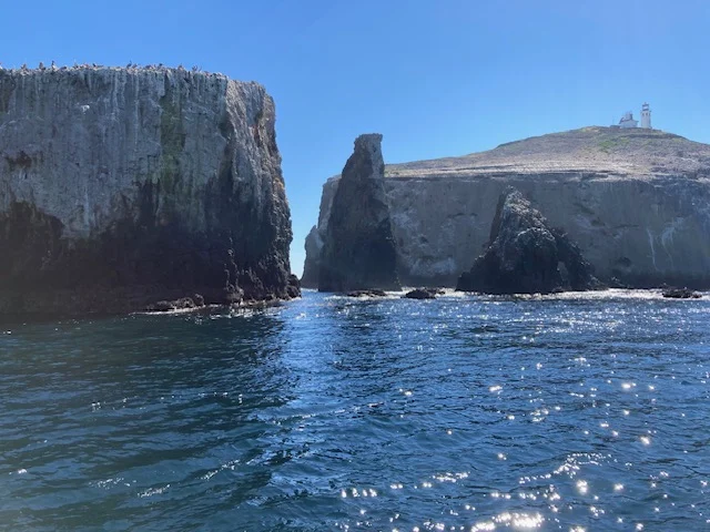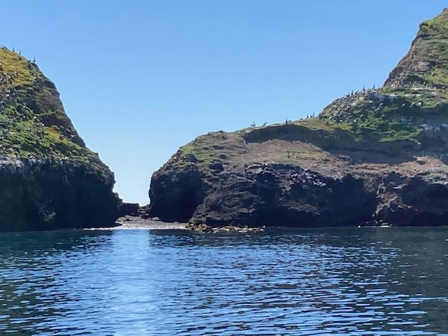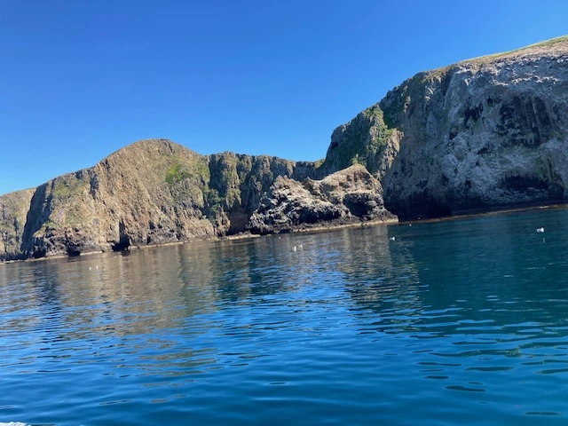 A seal lumbered slowly behind the boat as we were leaving the port, just one of the seals and sea lions we saw on the journey around Anacapa Island. Crossing the channel, riding toward the sun, there must have been a lot of moisture in the air. The sun refracting off the air left a glowing haze in the distance. We slowed down when we saw gray whale fluke trails, following the path, but the whales did not surface for us. I also noticed three ocean oil rigs. I thought it was interesting that they were so close to protected water and islands.