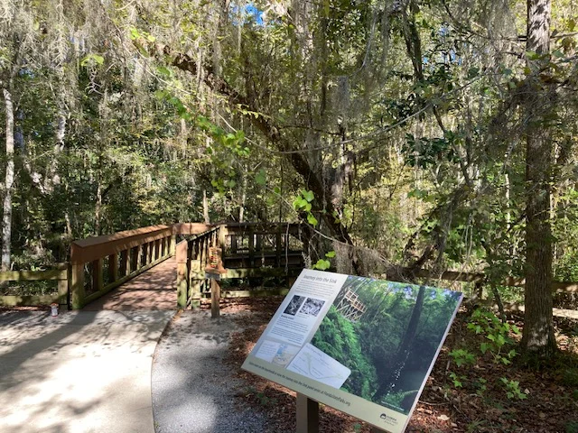 After a good night’s rest, my next stop was Devil’s Millhopper Geological State Park which has a large bowl-shaped sinkhole that is 120 feet deep, with a miniature rain forest at the bottom. What I found interesting is that small streams and waterfalls trickle down to the bottom and disappear into crevices in the ground. There is no pool or pond at the bottom. Though Florida has a lot of sinkholes, this is one of the largest, and because of the depth, researchers have learned a great deal about Florida’s natural history by studying fossilized remains left in the layers and at the bottom of the sinkhole.