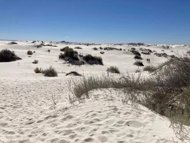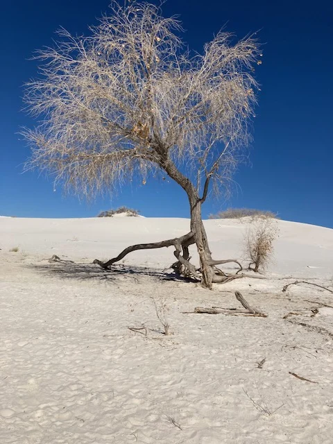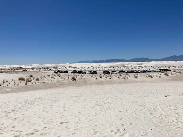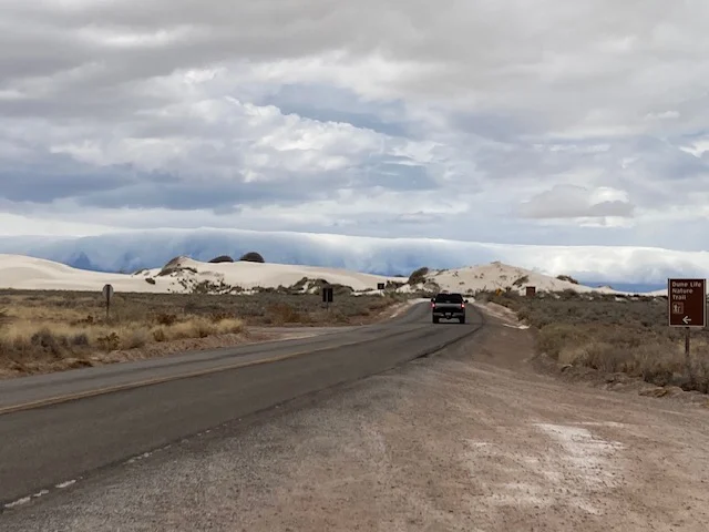 It was raining so I booked one more night thinking I would traipse the sand dunes when the sand was dryer. Then the sun came out, beckoning me to White Sands and it was raining hard when i got there. I drove through the park, barely able to see the road when the pavement ended and the sand began. Between the white road against white dunes and water drops on the windshield, it was hard to discern where to drive. It slowed to a drizzle, opening up the opportunity to see the vast dunes and the mountains in the distance. The storms around the desert and wind bringing clouds over the surrounding mountains was spellbinding!